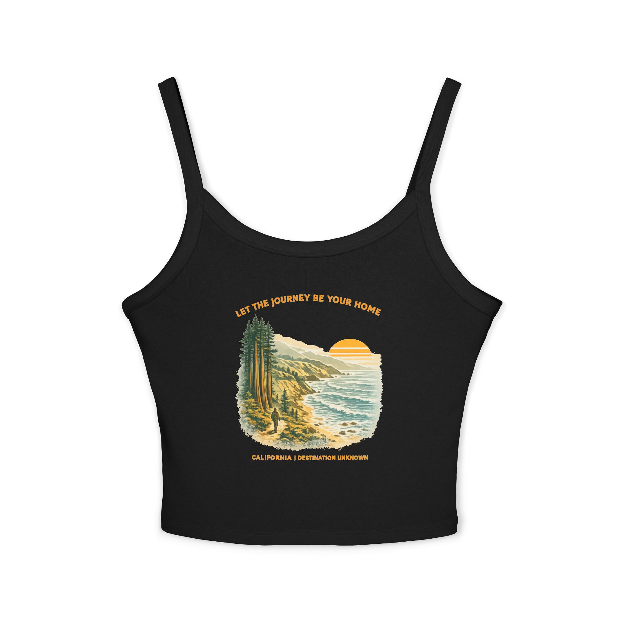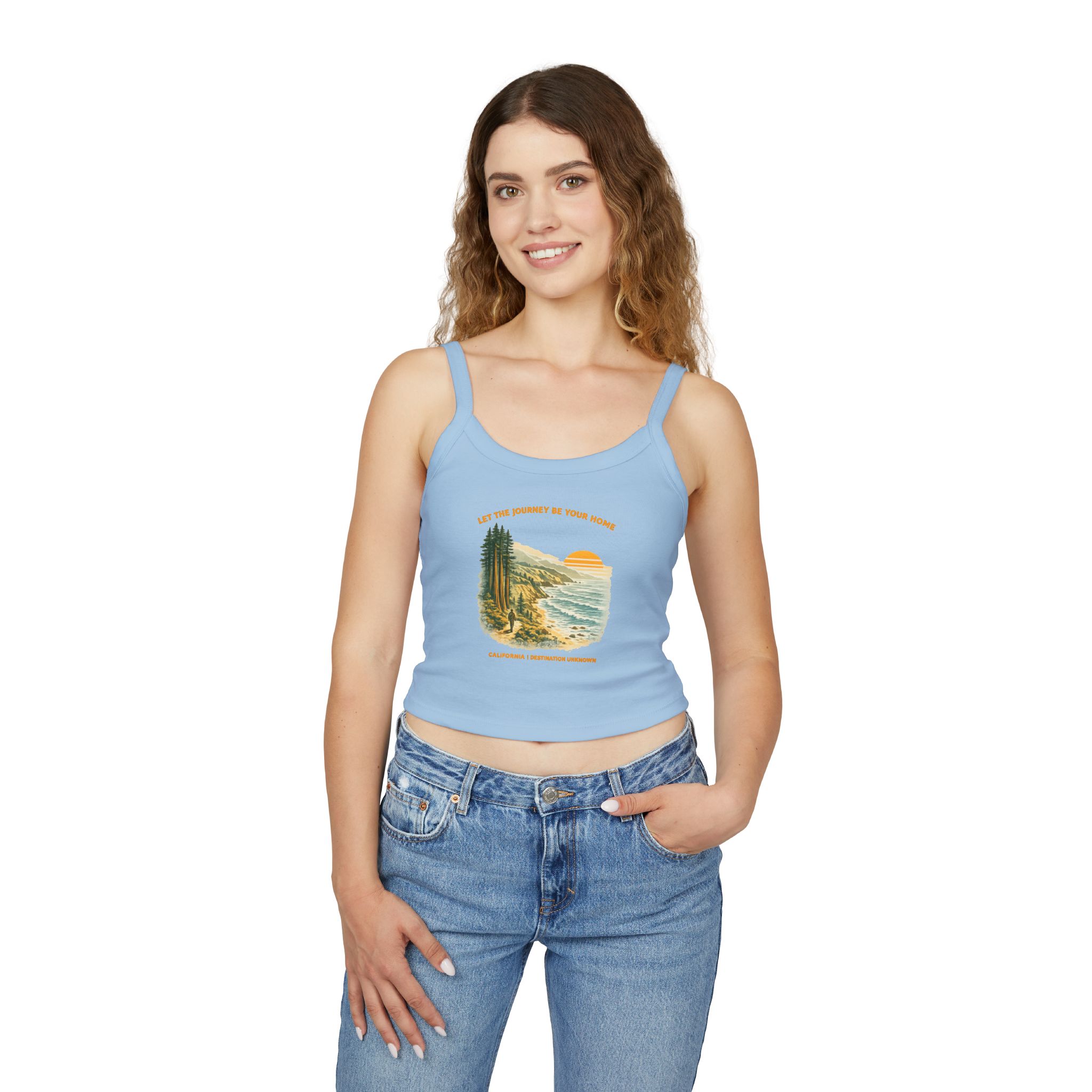 Designed for warm days, open roads, and coastal air, the Let the Journey Be Your Home Spaghetti Strap Tank brings a lighter expression of the Destination Unknown mindset.