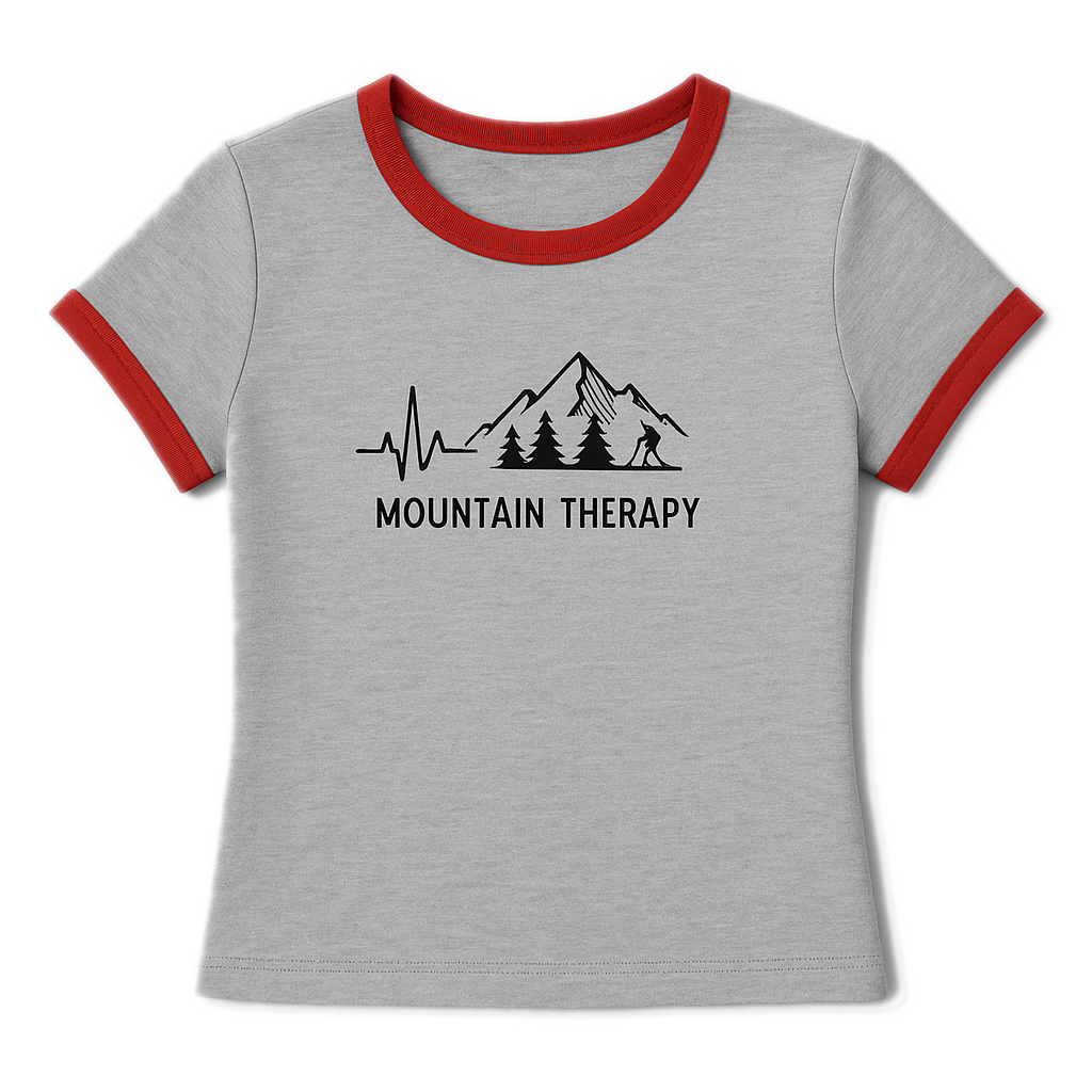 This soft, body-hugging crop top features contrast trim and a minimalist mountain-therapy graphic—perfect for hikes, road trips, or everyday outdoor-inspired style.